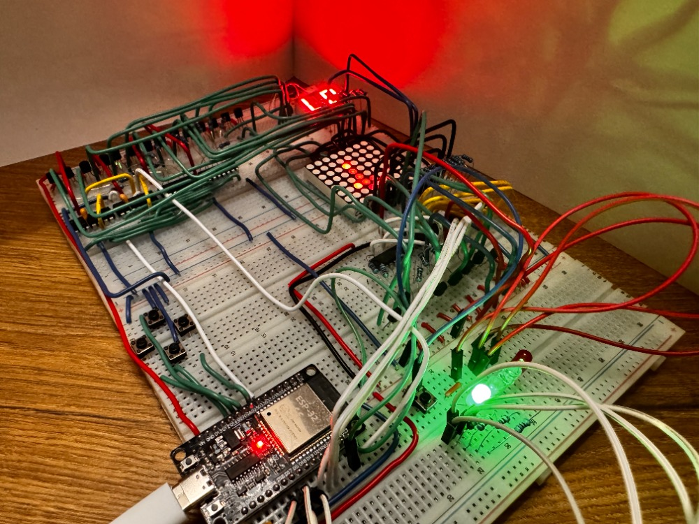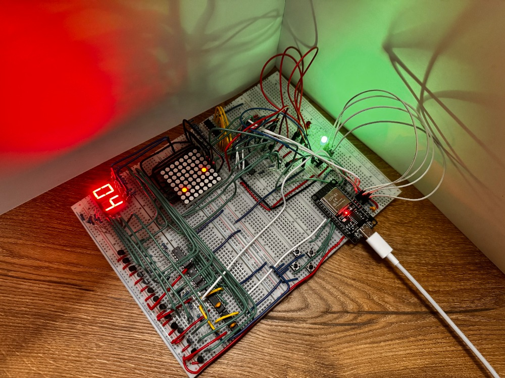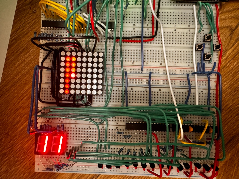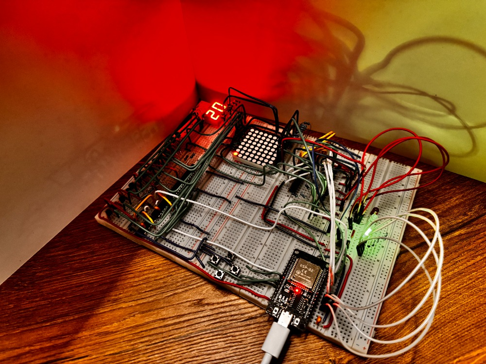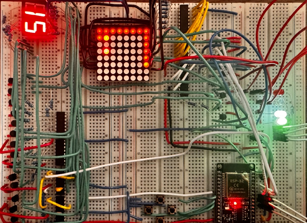 Класическата игра със змията, направена на esp32 и 8х8 LED матрица, както и вграден брояч за дължина. Включва различни функции надграждащи класическата игра, като например бутон за регулиране на трудността и автопилот (змията сама навигира из полето докато не победи).