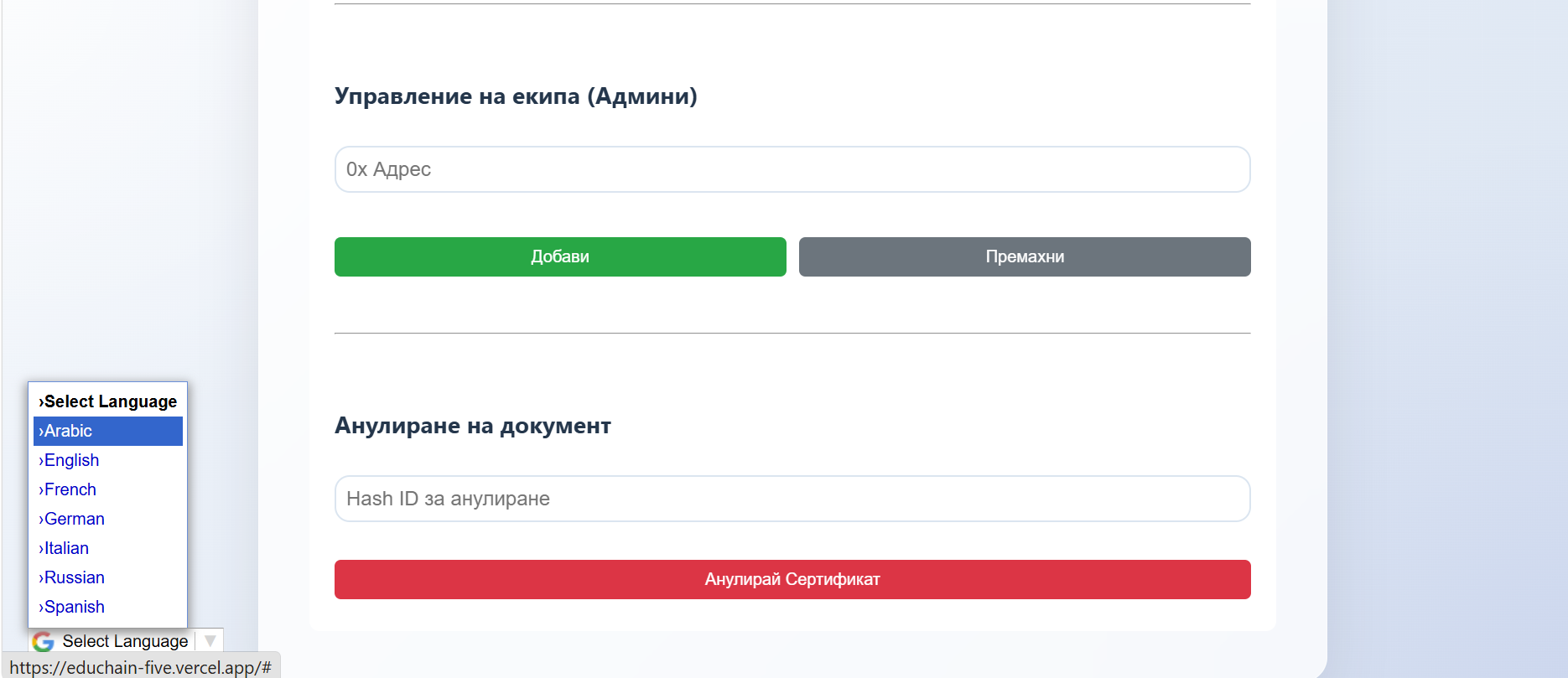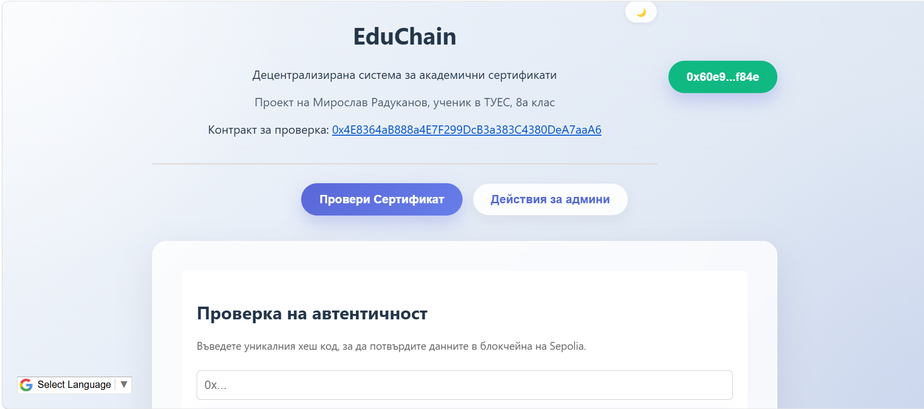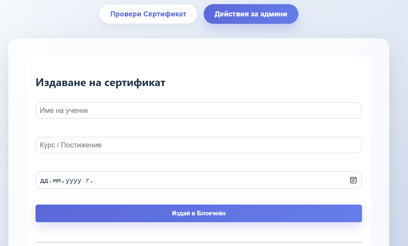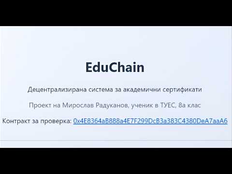 EduChain е иновативно Web3 приложение (dApp), създадено да реши проблема с фалшифицирането на дипломи и сертификати чрез силата на блокчейн технологиите. Проектът предлага сигурна, прозрачна и неизменима среда за издаване и проверка на академични постижения в реално време.