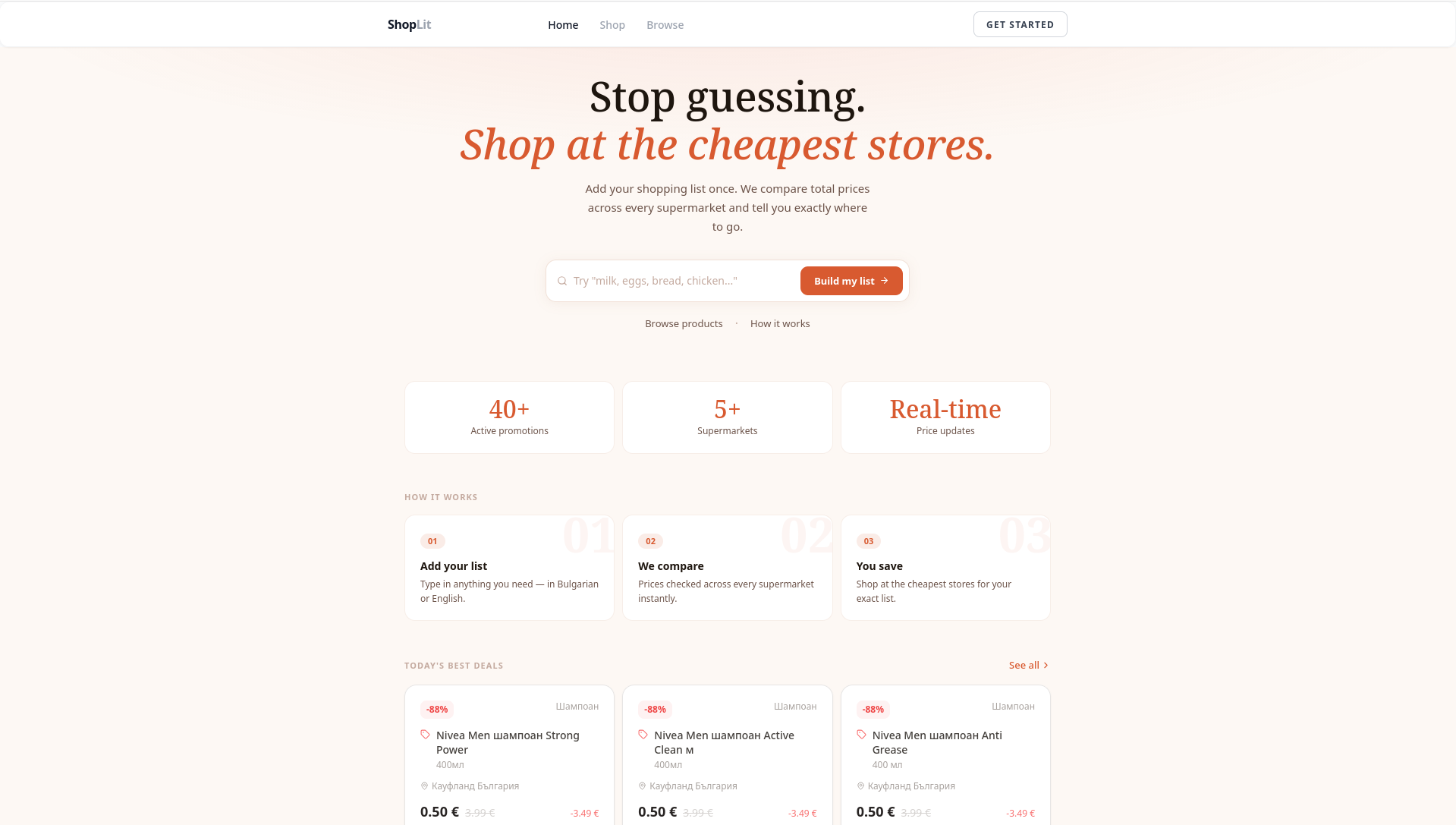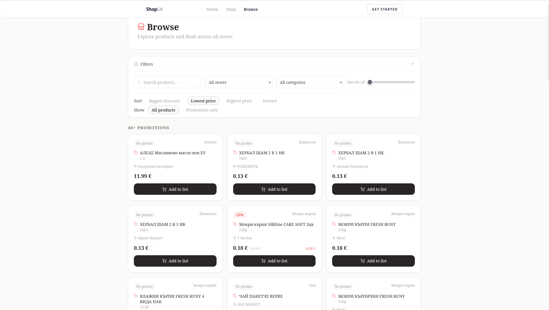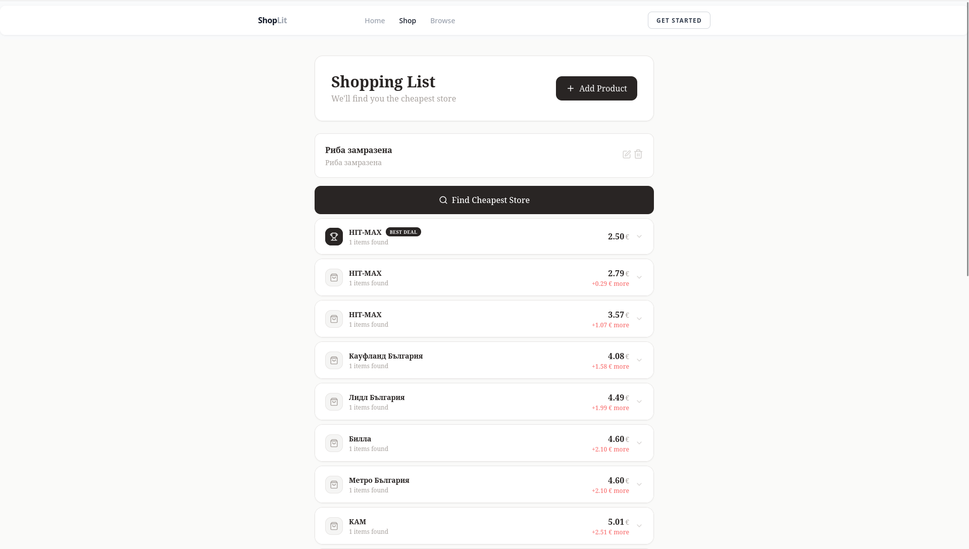 Shoplit е иновативна платформа, създадена да помага на потребителите в България да пазаруват по-умно, по-бързо и по-евтино. Функционирайки като личен шопинг асистент, системата автоматично сравнява цените в различни супермаркети и изчислява най-изгодните вариант за закупуване на целия ви списък с продукти. Освен че ви показва откъде е най-евтино да пазарувате, Shoplit може да оптимизира избора ви и спрямо разстоянието до конкретния магазин. Платформата ви улеснява чрез интелигентно търсене с гъвкави филтри, бърз достъп до промоции и умни AI препоръки за ефективно планиране на бюджета. Чрез личния си профил можете да запазвате чести списъци и да задавате предпочитания към марки, а за търговците е предвиден бизнес портал с ценни анализи на пазара. Главната мисия на Shoplit е да улесни цялостното ви преживяване при пазаруване.
