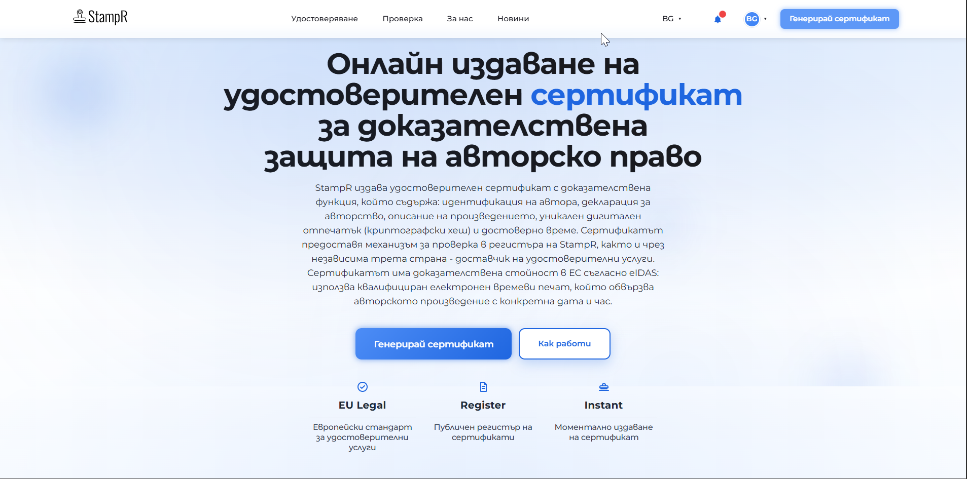 StampR е платформа за издаване на цифрови сертификати за авторство с квалифициран електронен времеви печат от BORICA B-Trust — с правна сила в целия Европейски съюз по регламент eIDAS. Когато качиш файл, системата изчислява SHA-256 хеш и го изпраща към BORICA B-Trust, откъдето получаваш верифицируем сертификат с точен timestamp по стандарт RFC 3161. Оригиналният файл никога не напуска твоето устройство — само криптографският му отпечатък. Резултатът е безспорно доказателство кой е създал дадено произведение и кога точно — признато от съд, издадено в секунди, от 2.50 EUR.