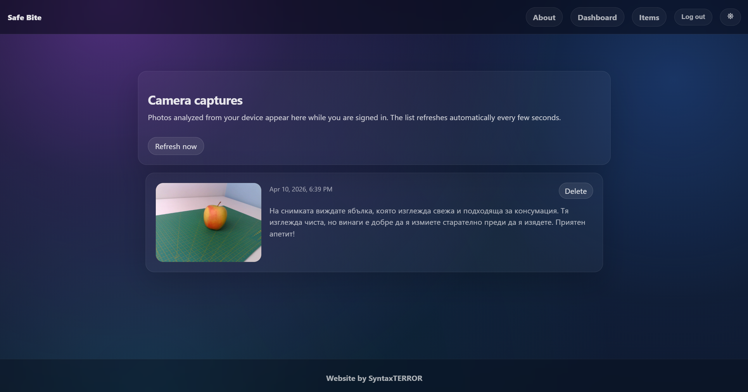 SafeBite решава този проблем чрез камера, монтирана на вградено устройство, което сканира храната в реално време. Системата използва разпознаване на изображения с изкуствен интелект, за да анализира хранителния продукт.