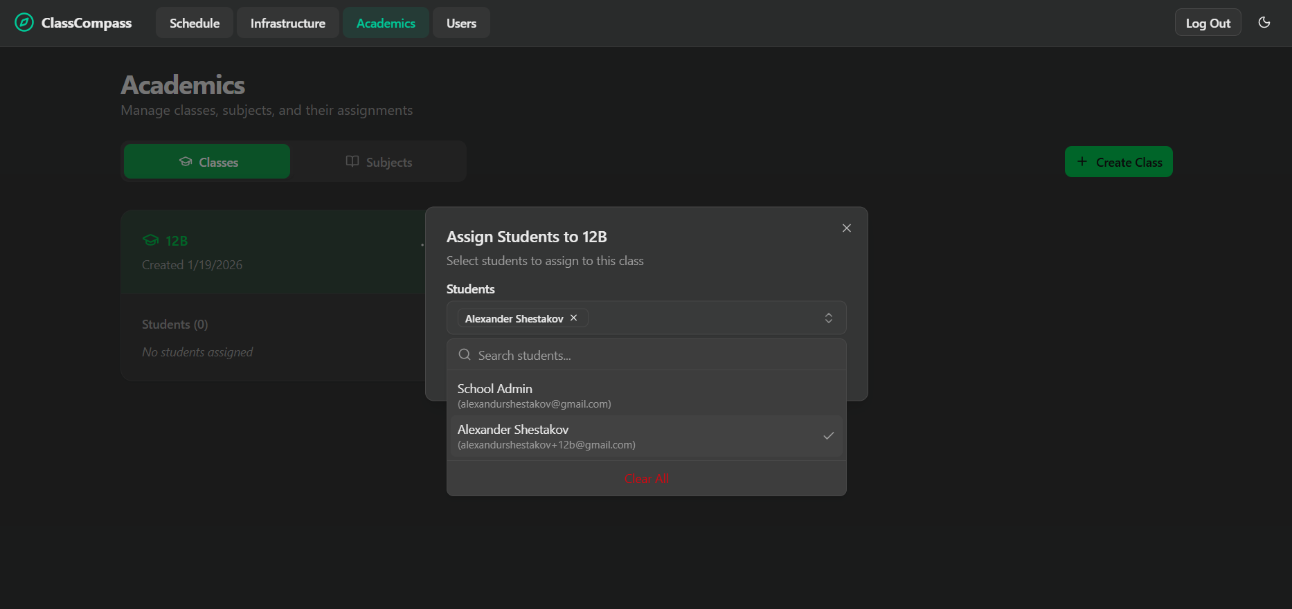 ClassCompass съчетава функционалност и съвременен дизайн, за да направи училищната логистика лесна както за администратори, така и за учители и ученици.