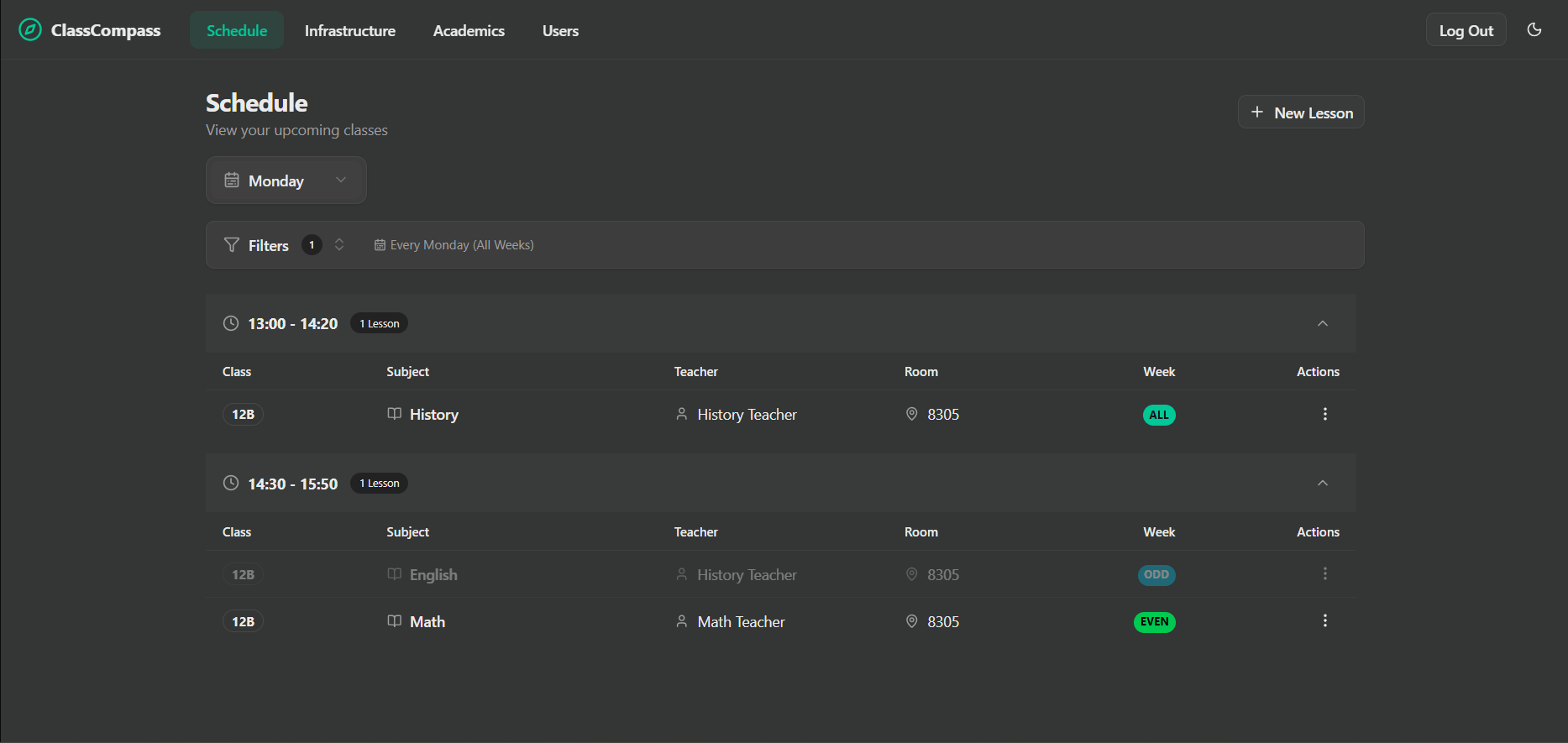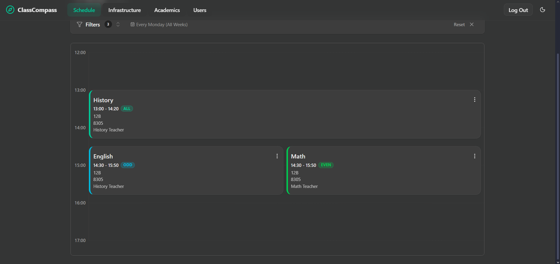 Забравете за объркващите графици и безкрайното търсене на кабинети. ClassCompass е уеб платформа, създадена с фокус върху потребителя, която превръща административния хаос в елегантно и подредено цифрово преживяване.