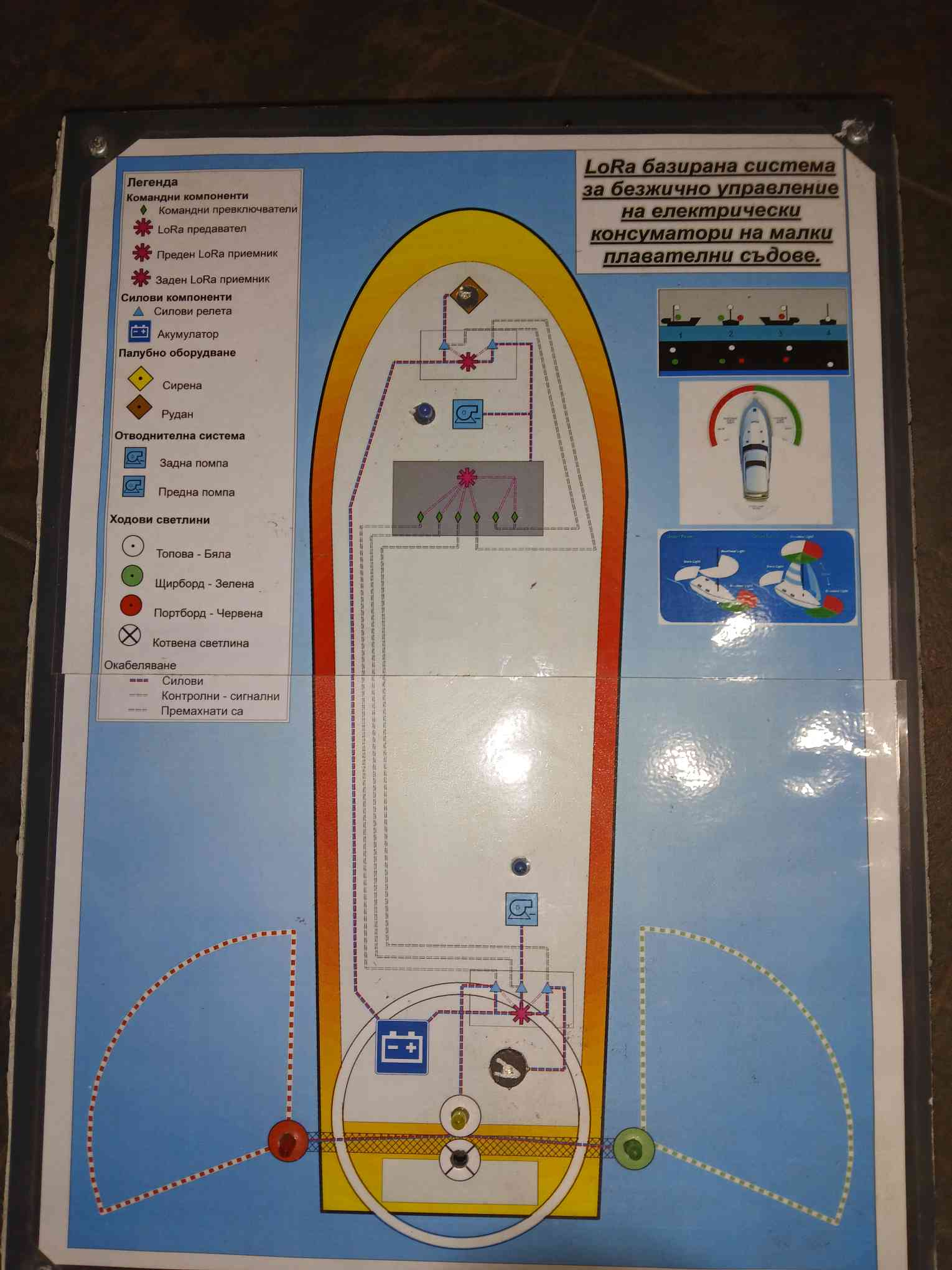 Система за безжична комуникация при малки плавателни съдове, базирана на LoRa технология, предназначена за управление и контрол на бордови електрически консуматори чрез разпределена мрежа от вградени модули. Целта на проекта е да се намали необходимостта от окабеляване, да се повиши надеждността на електроинсталацията и да се осигури ефективно и сигурно безжично управление на бордовите системи.